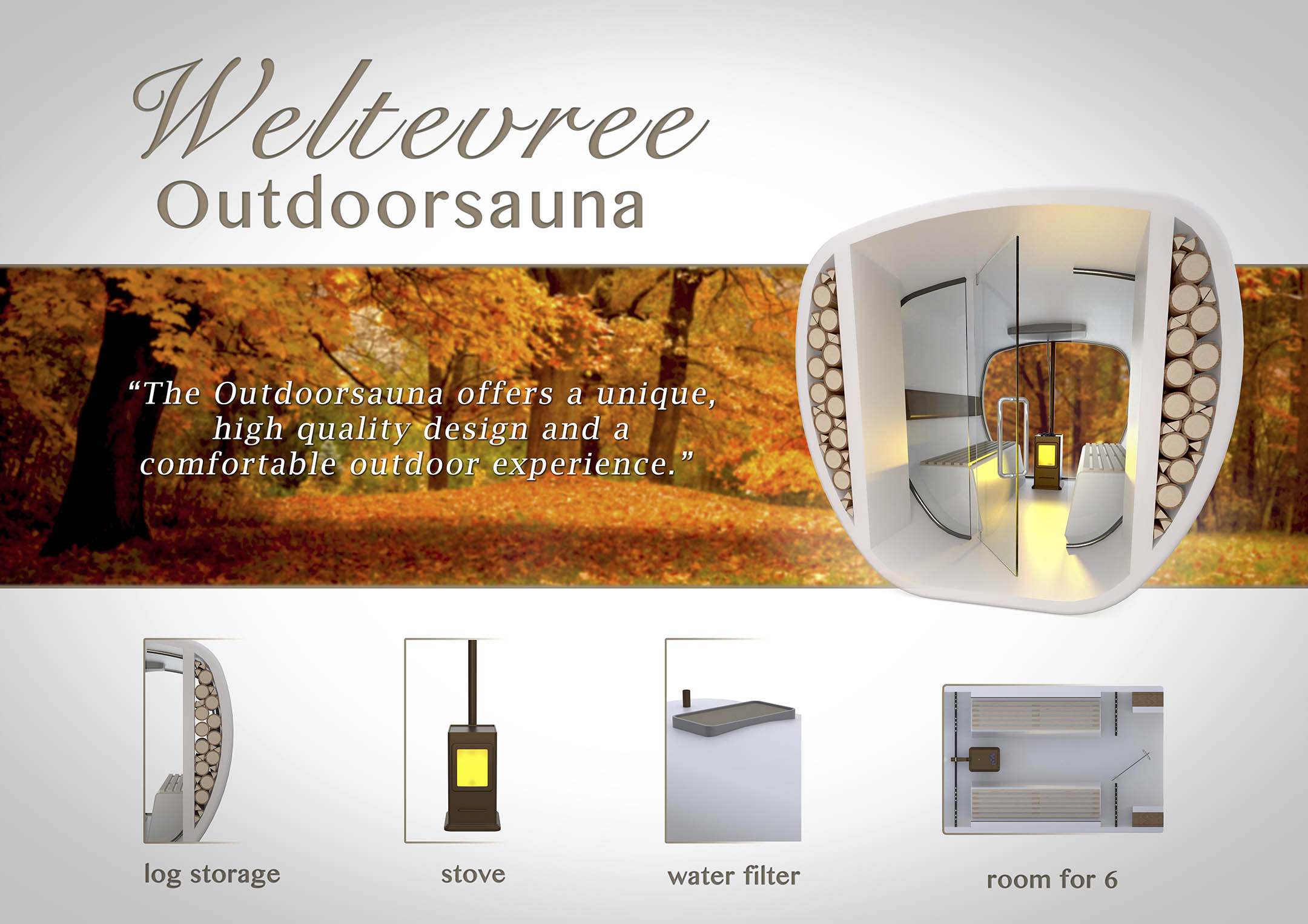 The outdoor sauna designed for Weltevree is a special mention in my portfolio. It was picked as a favourite by the judges during the presentation event. Even though the design stems from the first year of my bachelor's degree, to this day it is still displayed in the facultay as a good design example during the Bachelor Open Days.